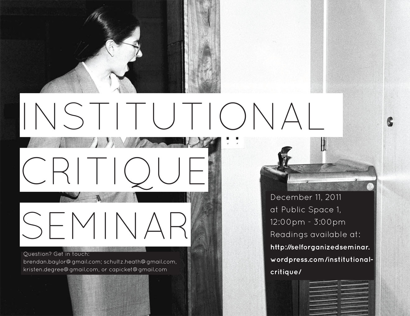 In December 2011 we held a seminar on institutional critique with faculty, graduate students, and artist from around Iowa City. We created a reader for the event, which is available here can be downloaded here, all in one pdf.