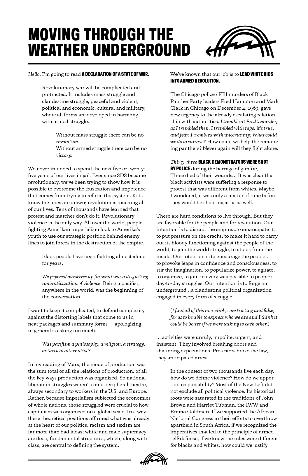 Preliminary draft of an experimental writing project compiled of fragments taken from various histories, memoirs, and primary documents relating to the Weather Underground Organization (WUO) — a militant revolutionary group active from the late 60s to mid 70s, grown from the ashes of the Students for a Democratic Society (SDS). The resulting collage is an attempt at writing that cuts through time and space using texts that compress or collide a series of affective, ideological, philosophical, and political fragments as told by historians, participants, and friends of the Weather Underground, all given equal weight and largely indistinguishable.