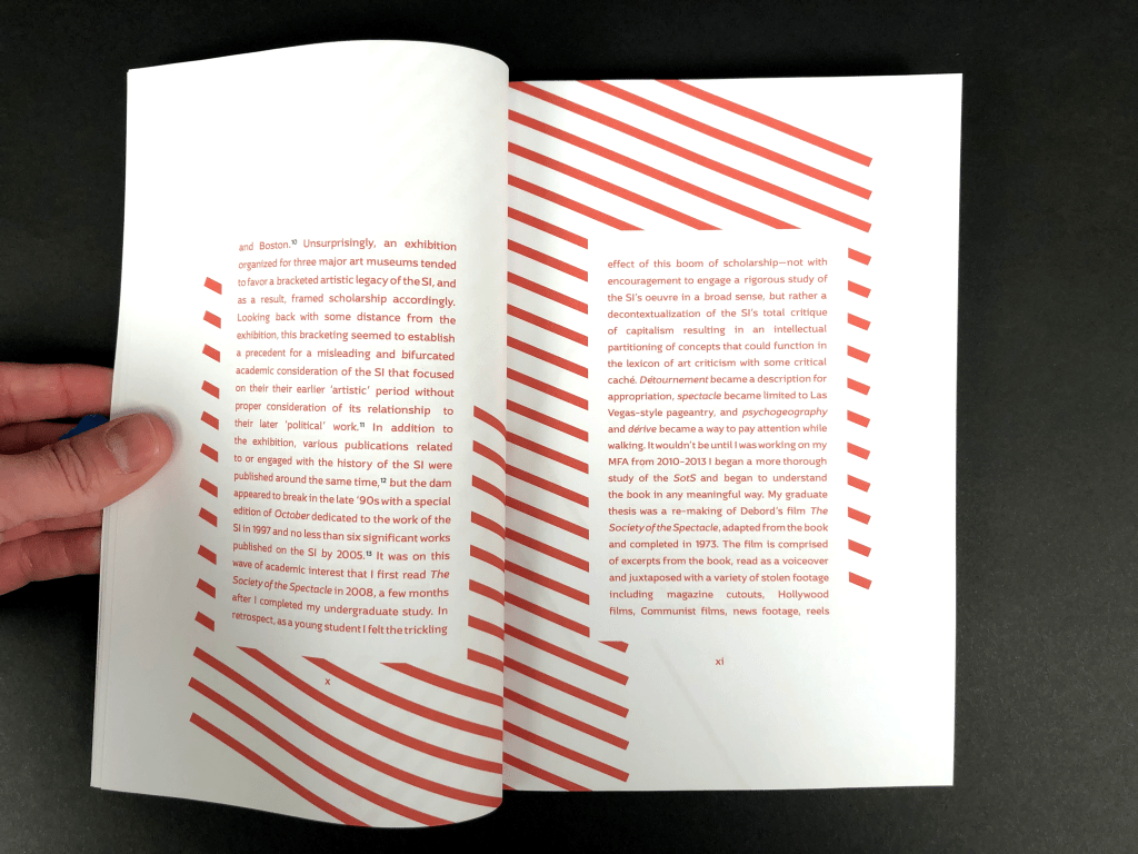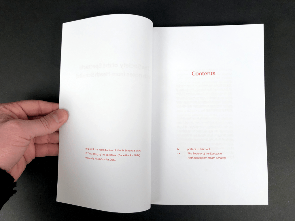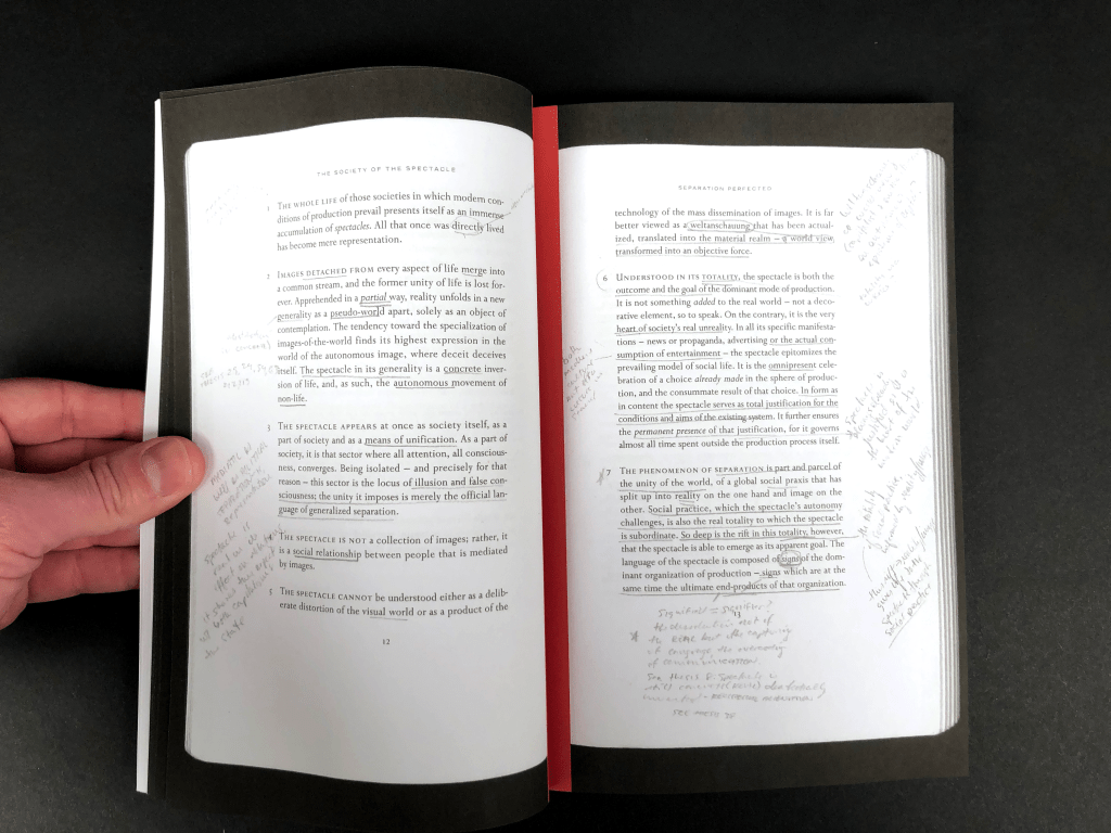 The book (2019) is, simply, a scan of my copy of The Society of the Spectacle (1967) by Guy Debord. I have completed various projects engaged with the book and have compiled significant notes in the process, most of which are reproduced here as elaborate annotation and marginalia. The book also includes a preface by me which discusses the history and significance of The Society of the Spectacle as well as my relationship to it for the past ten years.